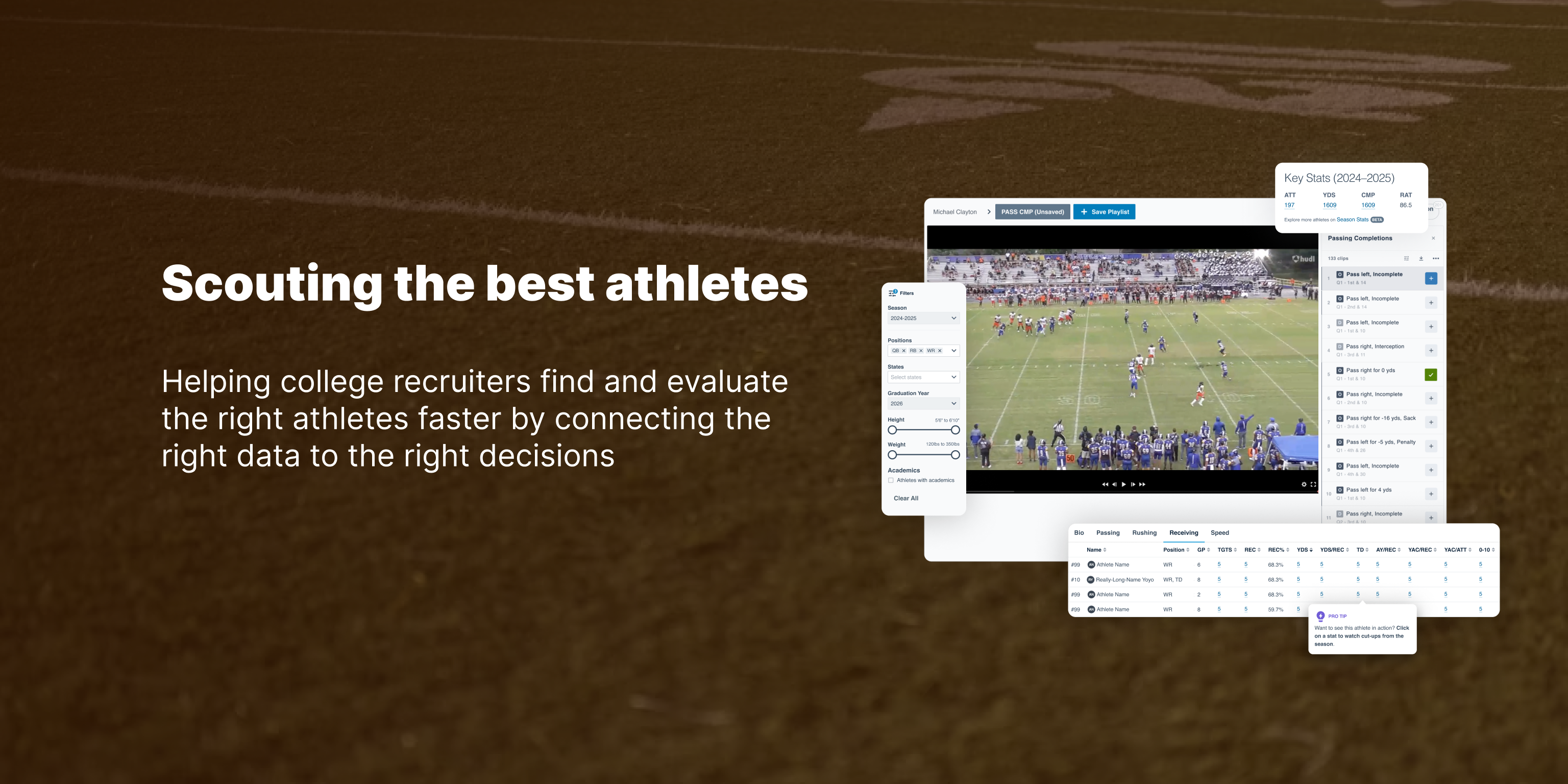 Division 1 college recruiters evaluate thousands of athletes each season, but their tools were disconnected and difficult to use. The existing workflow relied heavily on manual playlist creation and video review, often without the data needed to support confident decision-making. Recruiters needed a faster and smarter way to discover, evaluate, and track athletes. The solution needed to combine objective performance data with contextual video clips in a single, efficient workflow.